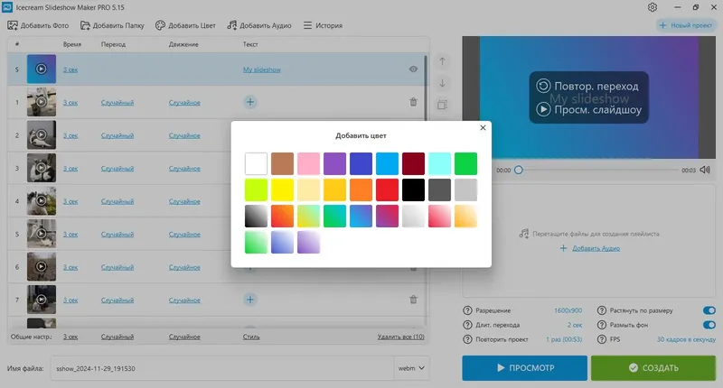 Для создания слайдшоу в программе достаточно выбрать необходимые фотографии, добавить их в проект и расположить в нужном порядке. Затем можно применить эффекты переходов и наложить музыку, настроив её параметры для достижения желаемого звучания. После предварительного просмотра и корректировки настроек остается только нажать кнопку «Создать» и сохранить итоговое видео на компьютер или загрузить его напрямую на видеохостинг.