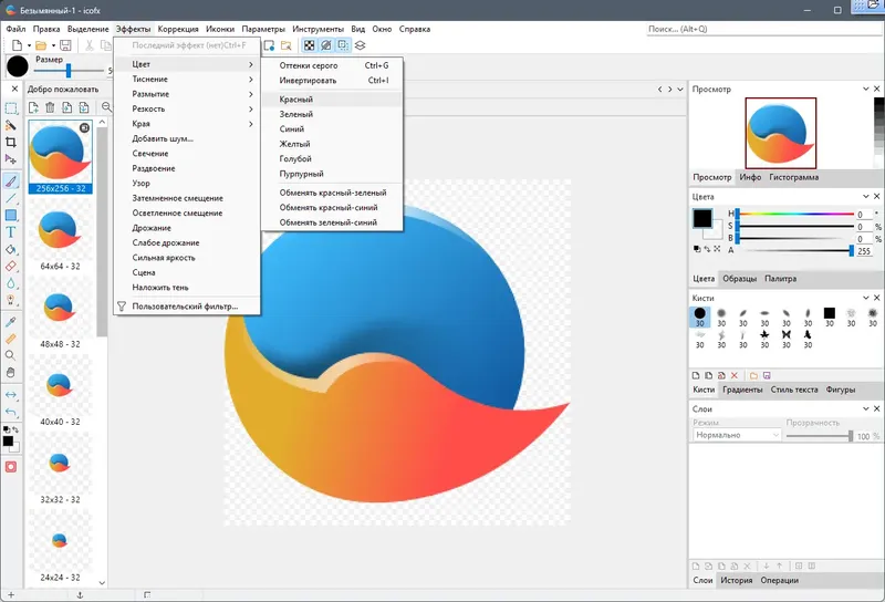 IcoFX — мощный и многофункциональный редактор, который позволяет создавать и редактировать иконки и курсоры различного уровня сложности. Программа поддерживает работу с популярными графическими форматами, такими как PNG, BMP, JPG, TIFF, GIF и JPEG2000, что обеспечивает широкие возможности для интеграции иконок в различные проекты. Среди ключевых особенностей — наличие более 40 эффектов, возможность настройки оттенков, насыщенности и яркости, а также встроенный конвертер и функция пакетной обработки файлов, что значительно ускоряет рабочий процесс. Кроме того, программа позволяет извлекать иконки из файлов Windows и Mac, а также работать с ресурсами внутри исполняемых файлов.