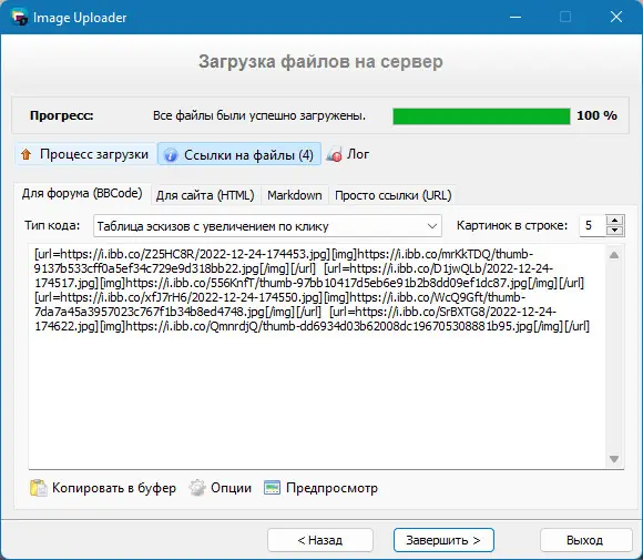 Image Uploader — это бесплатная программа для Windows с открытым исходным кодом, предназначенная для быстрого и удобного загрузки изображений, фотографий и кадров из видео в интернет. Она поддерживает работу с множеством популярных хостингов и файловых сервисов, автоматически создает миниатюры, масштабирует изображения и позволяет добавлять текст или логотип на фото. Благодаря широкому набору функций, программа идеально подходит для тех, кто регулярно делится изображениями в онлайн и хочет иметь универсальный инструмент для загрузки и обработки мультимедийных файлов.