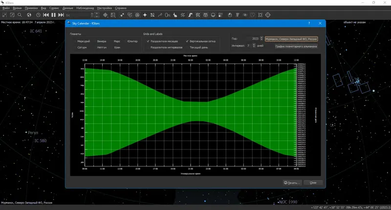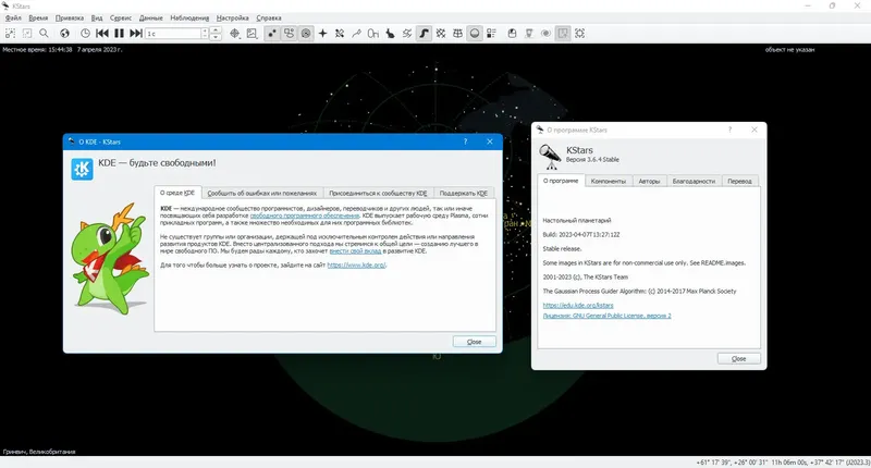 KStars — это бесплатное и кроссплатформенное программное обеспечение с открытым исходным кодом, предназначенное для астрономов-любителей, преподавателей и профессионалов. Оно позволяет точно моделировать ночное небо с любой точки Земли, в любую дату и время, предоставляя доступ к обширным каталогам звезд, планет, объектов глубокого космоса и спутников. Благодаря богатому функционалу и удобному интерфейсу, программа помогает исследовать вселенную, планировать наблюдения и осуществлять астрофотографию, а также служит ценным учебным инструментом для изучения астрономии и астрофизики. Весь спектр возможностей делает KStars незаменимым помощником в освоении звездного неба и расширении знаний о космосе.
