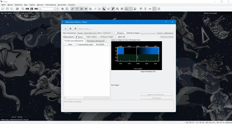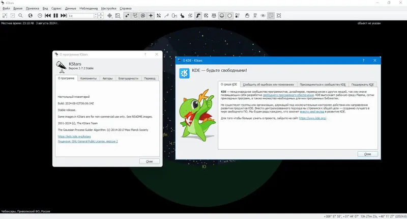 КStars представляет собой мощное средство для визуализации и моделирования ночного неба, которое работает на различных операционных системах, включая Windows, Linux и macOS. Оно обеспечивает реалистичную графическую симуляцию с возможностью выбора любой точки Земли, любой даты и времени. Включая более 100 миллионов звезд, 13 000 объектов глубокого космоса, все планеты, а также Луны и Солнце, программа является незаменимым инструментом для обучения, планирования наблюдений и астрофотографии.