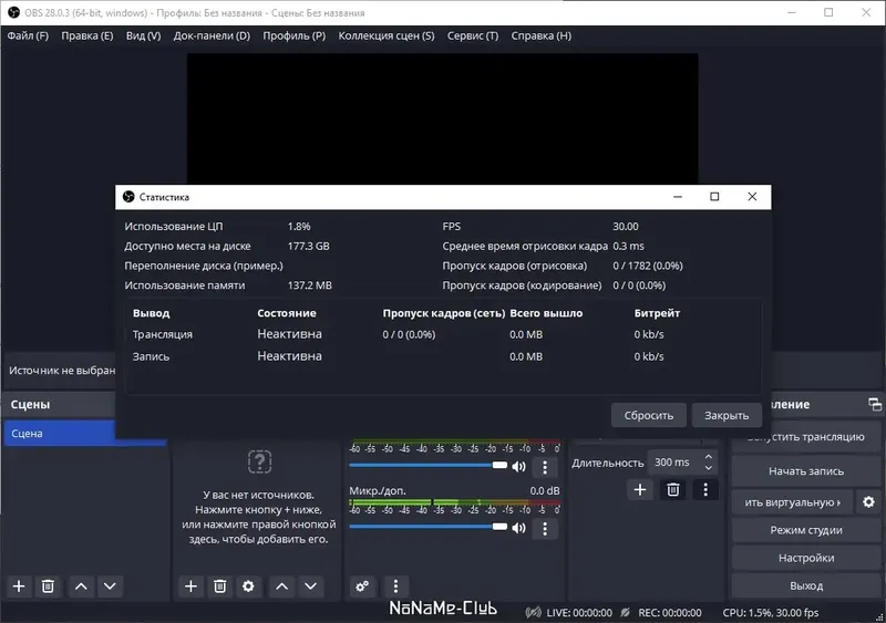 - Возможность добавлять неограниченное количество сцен и источников, включая окно браузера, изображения, видео и аудио.