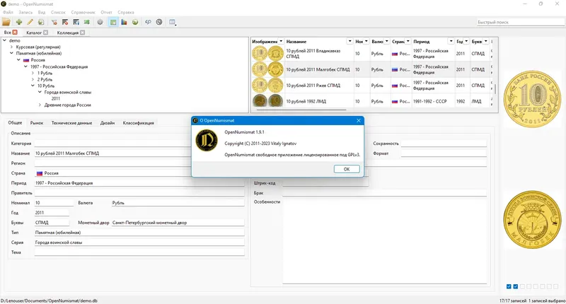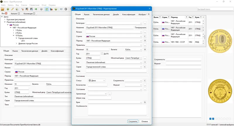 OpenNumismat — это универсальное приложение, созданное для коллекционеров монет, банкнот, марок и других предметов коллекционирования. Оно помогает систематизировать коллекцию, вести подробный учет и анализировать собранные экспонаты. Программа обладает широкими возможностями для настройки и удобного управления коллекцией, что делает ее незаменимым инструментом для любителей и профессионалов в области нумизматики и филателии.
