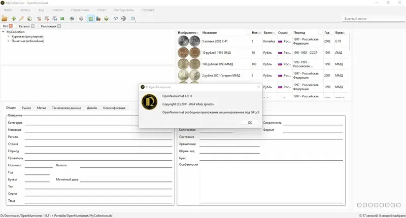 OpenNumismat — это универсальное приложение для коллекционеров, которое помогает систематизировать и управлять коллекциями монет, банкнот, марок и других предметов коллекционирования. Благодаря расширенным возможностям и удобному интерфейсу, программа обеспечивает полный контроль над вашими коллекциями, позволяя создавать детальные каталоги, отслеживать состояние и стоимость предметов, а также получать статистические отчёты. OpenNumismat подходит как для начинающих, так и для опытных коллекционеров, стремящихся к аккуратному и эффективному ведению своих коллекций.