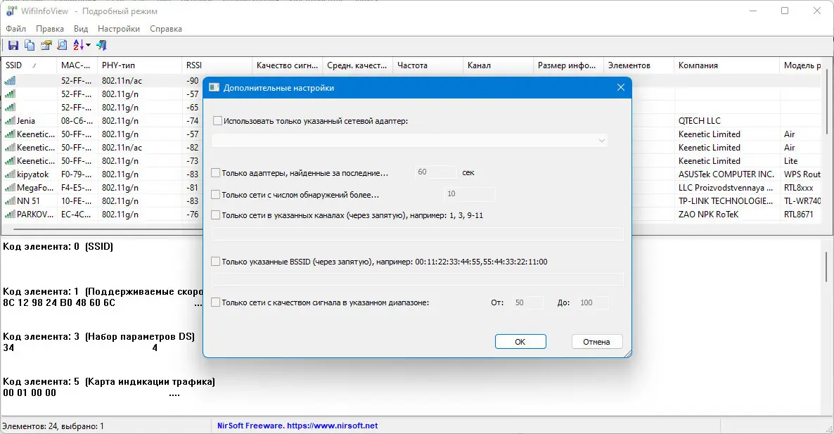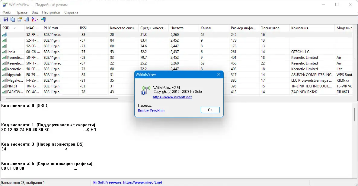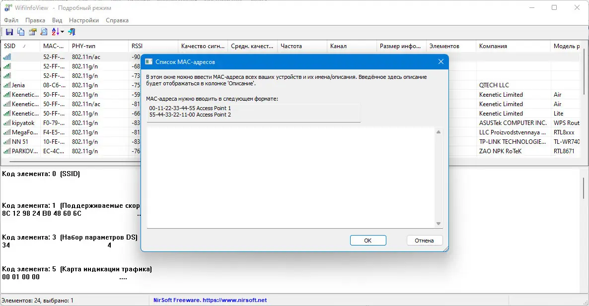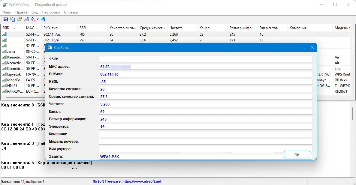 WifiInfoView — это небольшая бесплатная утилита для Windows, которая позволяет быстро сканировать окружающие беспроводные сети и получать подробную информацию о них. Программа отображает такие параметры, как имя сети (SSID), MAC-адрес, тип PHY (например, 802.11 g/n), уровень сигнала, частота, канал, скорость передачи данных и модели маршрутизаторов. Благодаря удобному интерфейсу и расширенным возможностям, она становится незаменимым инструментом для анализа Wi-Fi сетей и настройки беспроводных устройств.