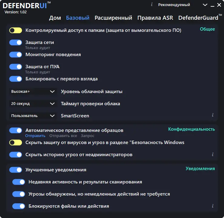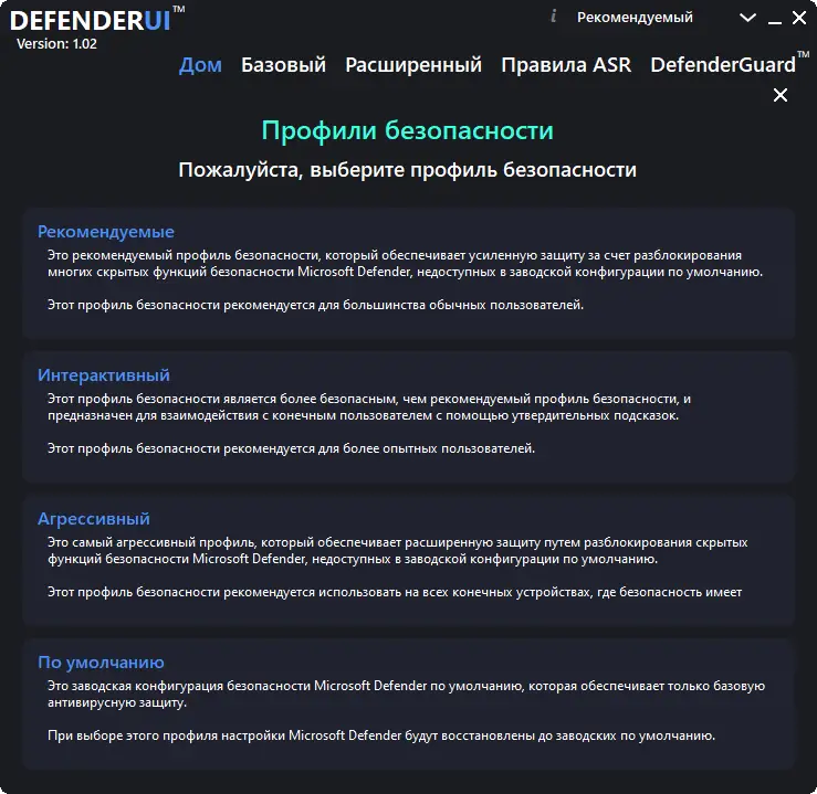 Для начала работы с DefenderUI достаточно скачать и установить программу на свой компьютер. После запуска интерфейс автоматически откроется в виде единого окна, где можно просматривать текущие настройки и изменять их по необходимости. В программе доступны предустановленные профили, которые позволяют быстро настроить уровень защиты — рекомендуется, интерактивный, агрессивный или настройки по умолчанию. Чтобы изменить параметры, достаточно выбрать нужный профиль или внести индивидуальные изменения с помощью простых элементов управления. Также программа позволяет сохранять пользовательские профили в облаке и быстро применять их на других устройствах, что делает работу максимально удобной даже при использовании нескольких ПК.