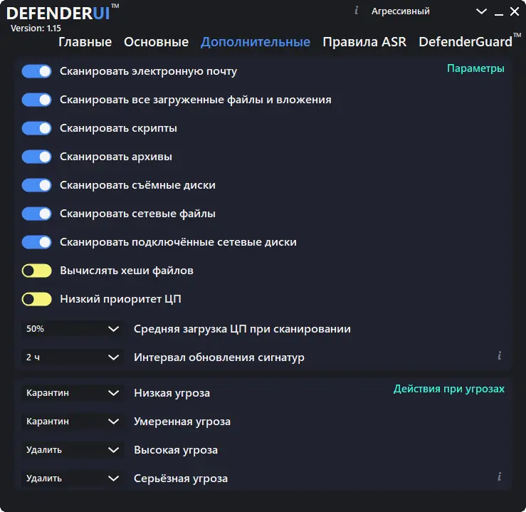 Для начала работы с DefenderUI необходимо скачать программу и установить её на компьютер. После запуска интерфейс откроется в виде единой панели, где доступны все настройки безопасности. Пользователю достаточно выбрать один из предустановленных профилей — рекомендуемый, интерактивный, агрессивный или по умолчанию — и применить его одним кликом. В программе легко настроить исключения из проверки, обновлять базы данных вирусов, а также включать или отключать защиту в реальном времени. Для более опытных пользователей доступны дополнительные параметры, позволяющие тонко настроить работу антивируса и повысить уровень защиты системы.