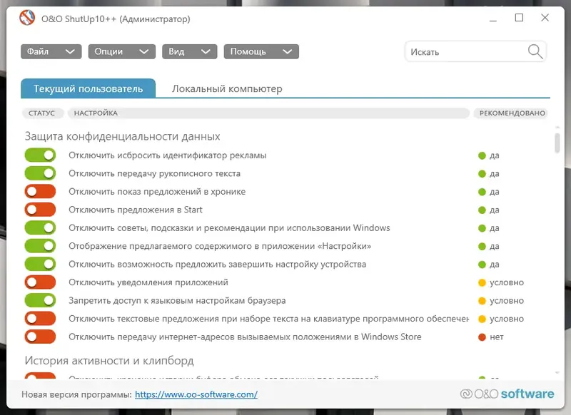 O&O ShutUp10 предоставляет пользователю возможность управлять настройками безопасности и конфиденциальности операционной системы Windows 10. Программа отображает все важные функции в едином интерфейсе, позволяя легко отключать службы определения местоположения, обновления системы и передачу диагностических данных. Благодаря этому можно значительно снизить уровень слежки и повысить уровень защиты личных данных. Встроенные рекомендации помогают определить, какие параметры рекомендуется отключить для повышения приватности, что делает программу удобным инструментом для настройки системы под индивидуальные нужды. Отказ от автоматических обновлений и отключение служб, собирающих пользовательские сведения, помогают обеспечить более высокий уровень безопасности и снизить риск утечки информации.