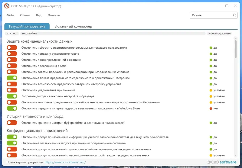 Использование O&O ShutUp10 позволяет самостоятельно регулировать уровень конфиденциальности, избегая нежелательной передачи данных сторонним службам.