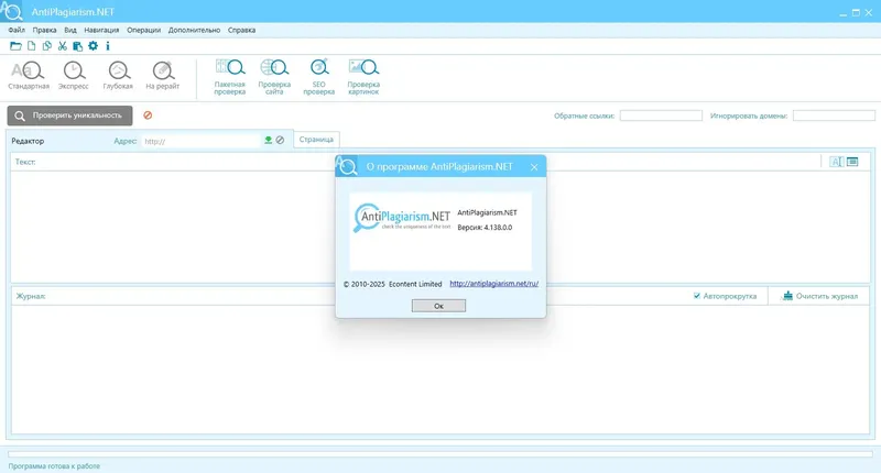 AntiPlagiarism.NET — это универсальный редактор для проверки текста на уникальность и обнаружения заимствований. Он использует современные алгоритмы анализа, сравнивая ваш текст с миллионами страниц в интернете и базами данных различных поисковых систем. Благодаря интуитивно понятному интерфейсу и широкому набору настроек, программа подходит как для профессиональных редакторов, так и для студентов и преподавателей, обеспечивая надежную защиту от плагиата.