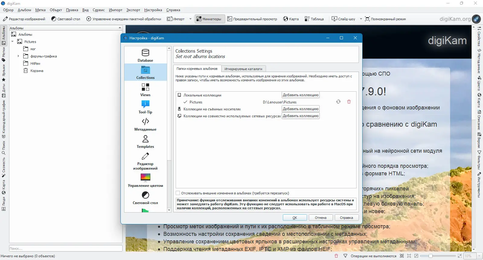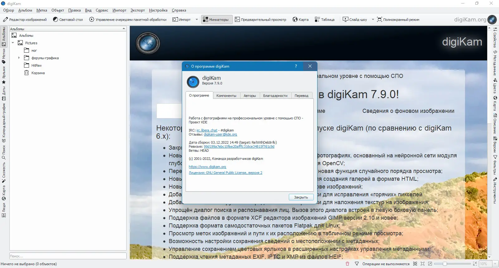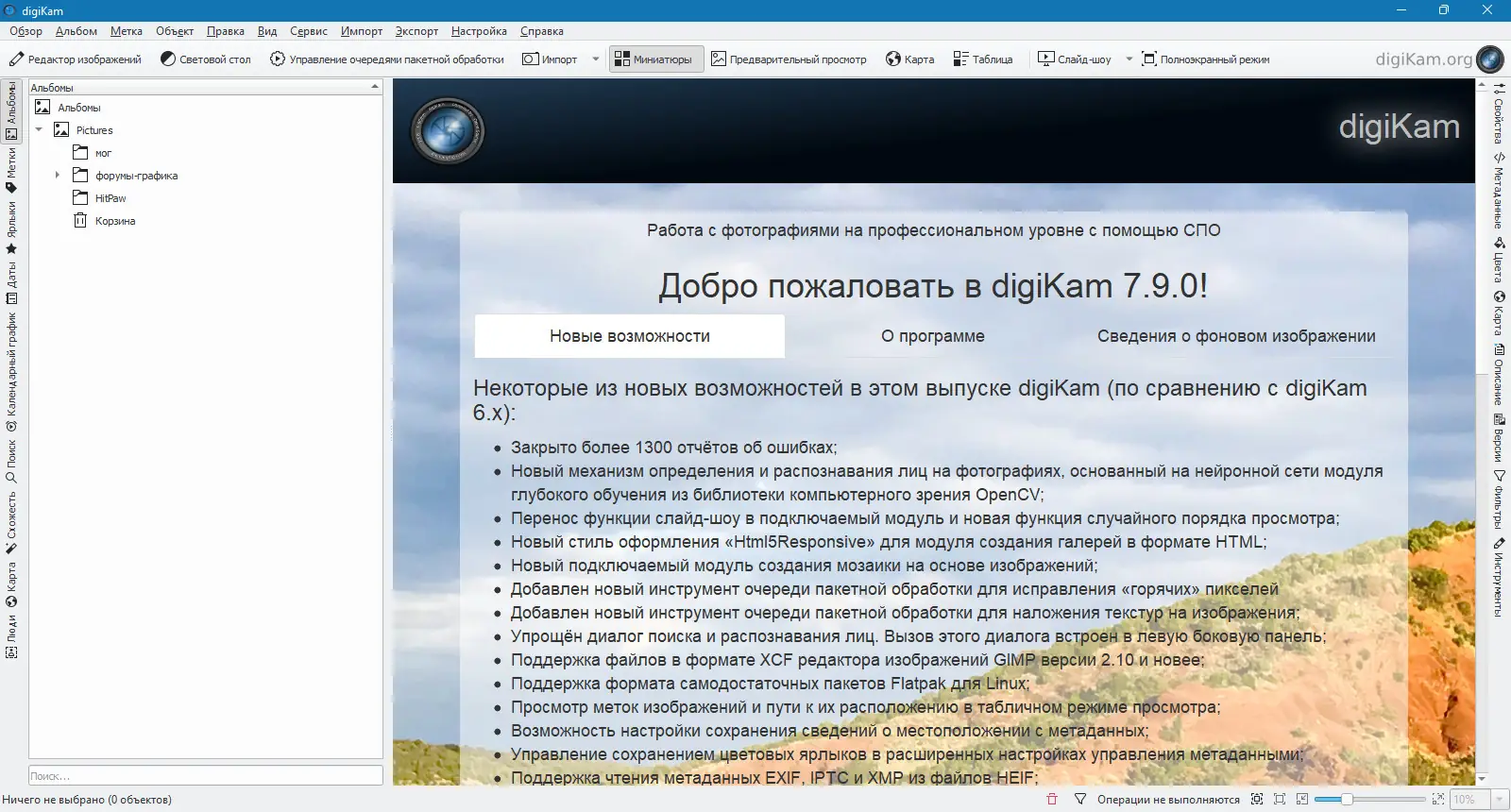 digiKam — это универсальный редактор и просмотрщик фотографий, разработанный для эффективного управления большими фотоколлекциями. Он поддерживает импорт фотографий и видео, а также работу с RAW-файлами, что делает его популярным среди профессиональных фотографов и любителей. Программа обладает богатым набором функций по каталогизации, добавлению тегов, оценок и геолокации, что существенно облегчает поиск и сортировку изображений. Благодаря возможности просмотра альбомов на карте, она идеально подходит для работы с географическими данными и метаданными.