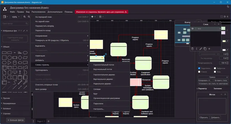 Работа с Draw.io очень проста благодаря современному интерфейсу, который не требует специальных знаний. Для начала достаточно открыть программу в браузере или загрузить её на компьютер, выбрать нужный шаблон или создать новый документ. В редакторе доступны инструменты для добавления элементов, соединений и текста, а также возможность настройки внешнего вида диаграмм. После завершения работы проект можно сохранить в различных форматах или экспортировать для использования в презентациях и отчетах.