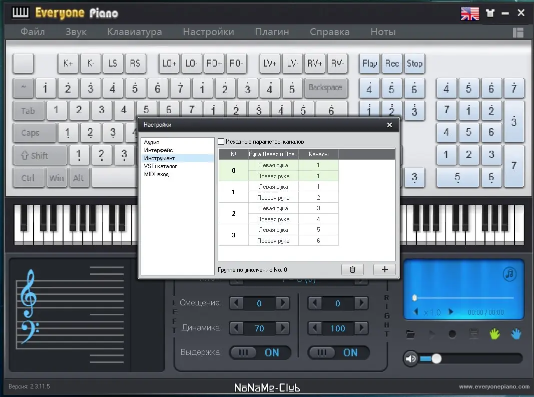 - Поддержка загрузки звуковых плагинов VSTI для расширения звуковых возможностей