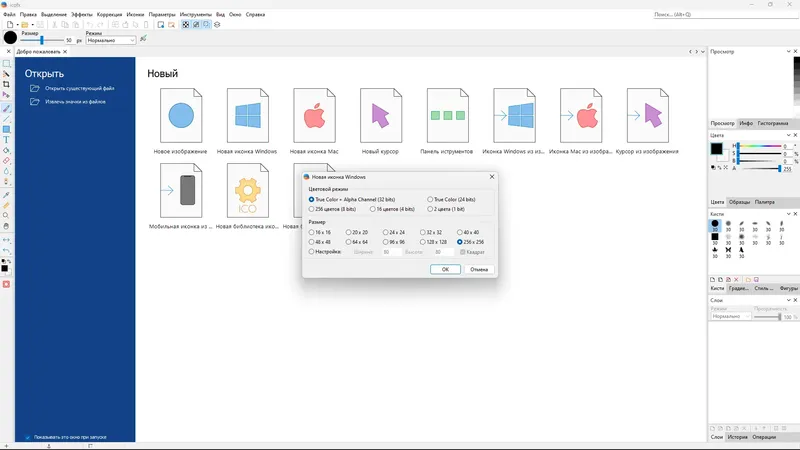 - Поддержка экспорта в популярные форматы: PNG, JPG, BMP, TIFF.