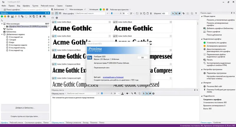 FontExpert — это мощный редактор шрифтов, предназначенный для просмотра, управления, поиска и оптимизации коллекций типографики. Программа позволяет быстро обнаруживать и устранять проблемы со шрифтами различных форматов, а также осуществлять их печать и каталогизацию. Благодаря интуитивно понятному интерфейсу и расширенной функциональности, FontExpert подходит как для профессиональных дизайнеров, так и для пользователей, желающих удобно управлять шрифтами на своем компьютере.