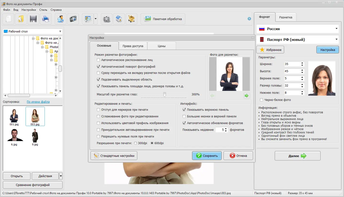 Фото на документы Профи — это удобная и быстрая программа, предназначенная для подготовки и печати фотографий на различные документы. Она включает множество встроенных форматов, что позволяет подготовить фото для внутреннего и заграничного паспорта, виз, удостоверений и пропусков без необходимости обращаться в фотосалон. Благодаря простому интерфейсу и автоматическим функциям программа позволяет всего за несколько минут получить профессиональное качество изображения, соответствующее требованиям различных государственных и частных учреждений.