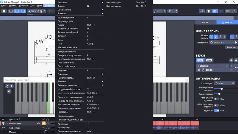 - Создание и редактирование нотных партитур и табулатур для гитары и других инструментов
