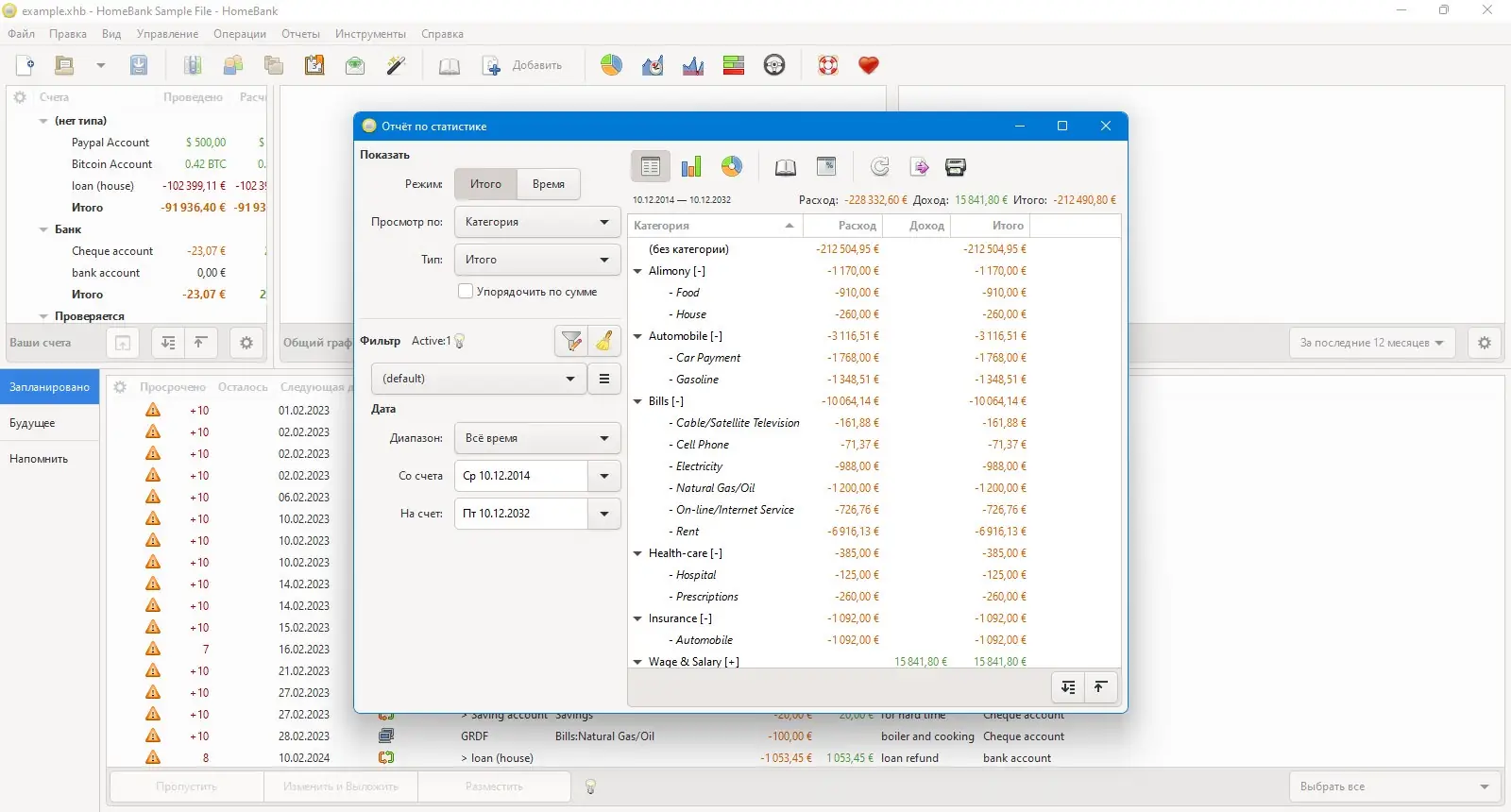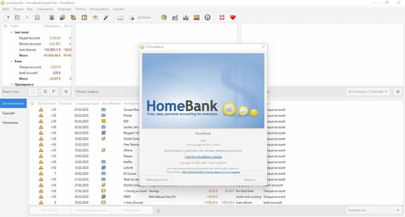 HomeBank — это универсальный редактор для учета личных финансов, предназначенный для упрощения контроля за денежными потоками. Программа обладает интуитивным интерфейсом и широкими возможностями по импорту данных из других популярных приложений, таких как Halyk Wallet или колл центр банков. Она позволяет вести учет различных типов счетов, включая наличные деньги, банковские карты, инвестиционные и кредитные счета. Благодаря функции автоматического определения категории платежа, пользователь быстро получает полное представление о своих расходах и доходах. HomeBank идеально подходит для тех, кто ищет простое в использовании приложение для ведения личного кабинета и анализа финансовых данных.