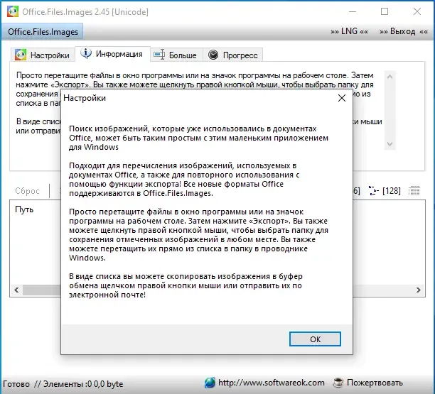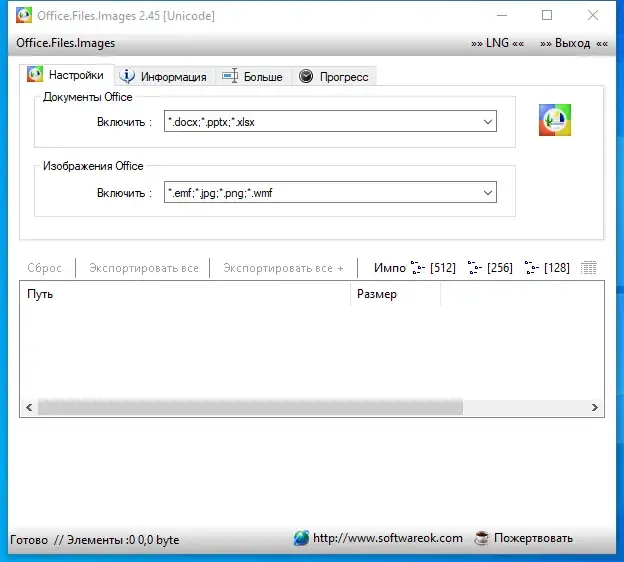 Office Files Images — это удобный инструмент для быстрого просмотра и управления изображениями, использованными в документах Office и Open Office. Он позволяет легко находить все картинки в файлах различных форматов, таких как docx, xlsx, pptx, ods и других. Благодаря этому программе можно эффективно организовать работу с изображениями, повторно использовать их и быстро получать визуальный обзор содержимого документов.