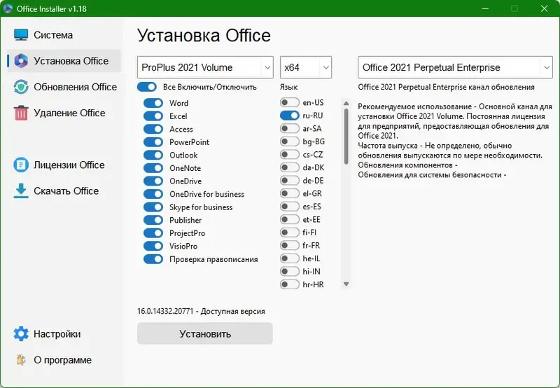 Office Installer — это мощный и гибкий инструмент для установки и настройки Microsoft Office. Он позволяет не только быстро установить выбранную версию Office 2016 или 2024, но и создать собственный офлайн-дистрибутив, что значительно упрощает массовое развертывание. Программа подходит для пользователей, которым важно контролировать процесс установки, управлять лицензиями и автоматизировать подготовку к работе с офисным пакетом.