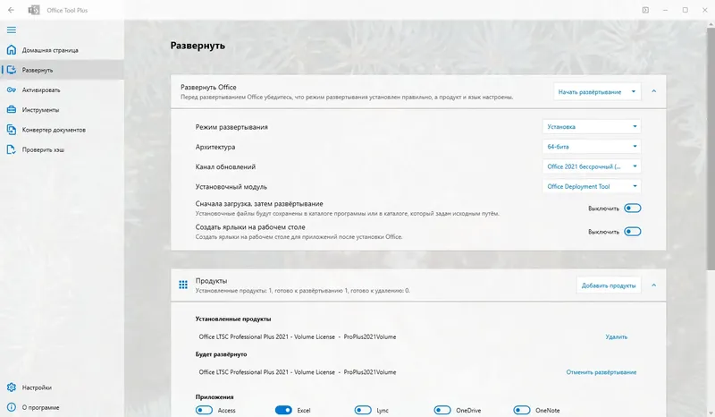 Office Tool Plus — это универсальный редактор и инструмент для работы с офисными продуктами Microsoft. Он позволяет легко управлять установкой, обновлением и активацией офисных пакетов, а также настраивать их под свои нужды. Благодаря интуитивно понятному интерфейсу и расширенным возможностям, программа станет незаменимым помощником для пользователей и системных администраторов.