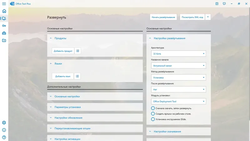 Для начала работы с программой необходимо скачать ее с официального сайта или выбрать портативную версию для использования без установки. После запуска интерфейс откроется в виде стильной панели, разбитой на категории по функциям. Вы можете выбрать нужную версию Office, язык, канал обновлений и настроить параметры автоматической установки. Для активации потребуется ввести приобретенный ключ продукта или воспользоваться KMS-методом. В процессе настройки программа предоставит все необходимые инструменты для быстрого и безопасного развертывания Office на нескольких устройствах. Создавайте собственные профили XML для автоматической установки и повторного использования на других ПК, что значительно ускорит подготовку рабочих станций.