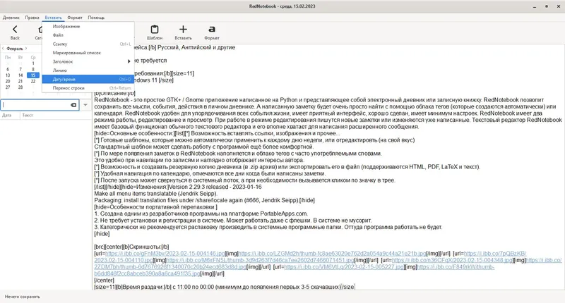 RedNotebook можно бесплатно скачать на официальной странице проекта. Программа совместима с различными версиями Windows и не требует сложной настройки. Благодаря простоте установки и портативной версии, ее легко запустить на любом устройстве без необходимости установки. Это делает RedNotebook отличным выбором для пользователей, ищущих надежный и легкий редактор для ведения личных записей и дневников.