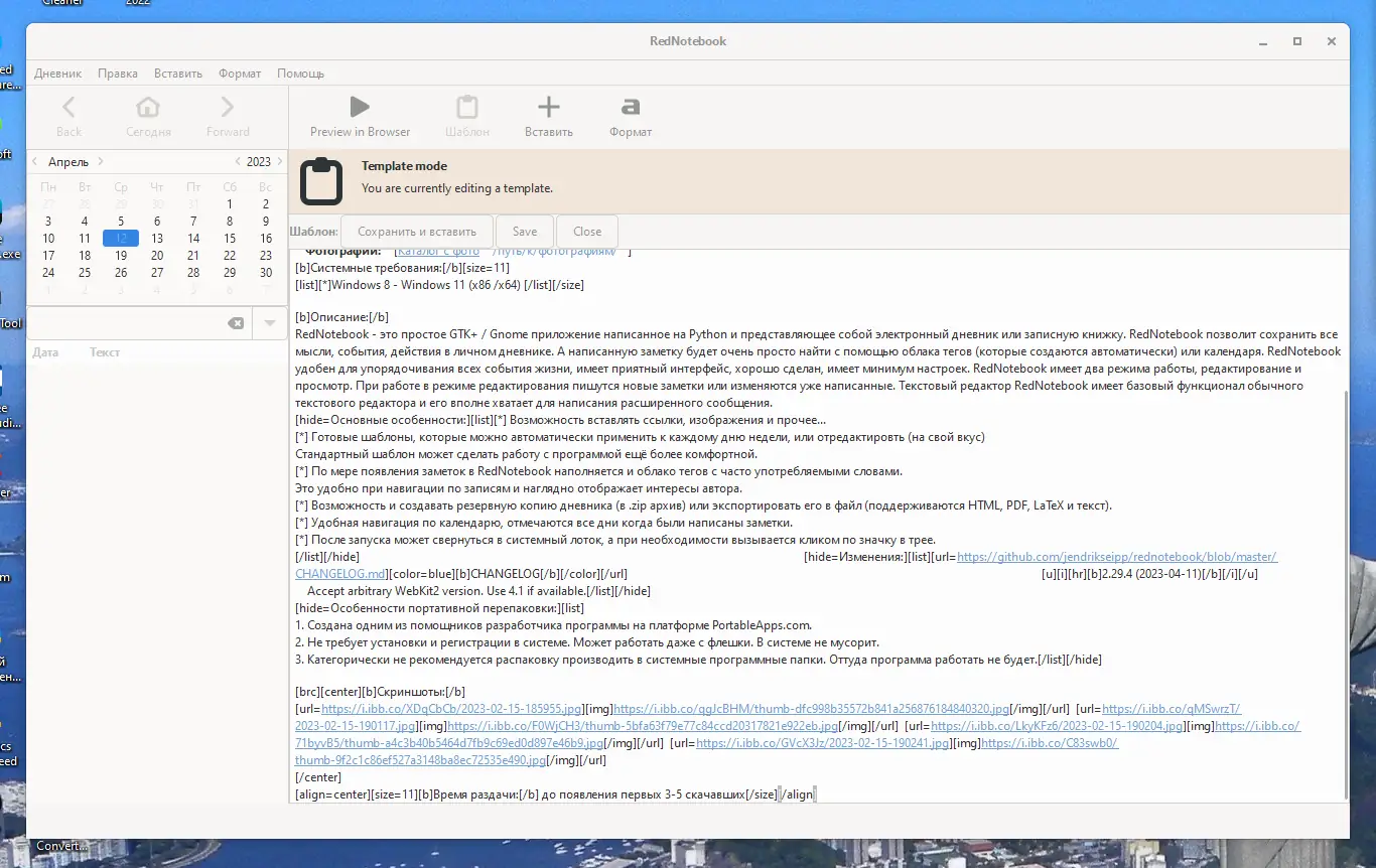 RedNotebook представляет собой универсальный электронный дневник, который обладает минималистичным интерфейсом и широкими возможностями для персонализации. Благодаря автоматическому созданию облака тегов, пользователи могут легко находить нужные записи, а встроенные шаблоны делают процесс оформления заметок более удобным. Программа поддерживает вставку ссылок, изображений и других мультимедийных элементов, что расширяет функционал и делает ведение дневника более насыщенным. Отдельной особенностью является возможность экспорта данных в форматы HTML, PDF, LaTeX и текст, а также создание резервных копий в ZIP-архивах, что обеспечивает безопасность и сохранность информации.