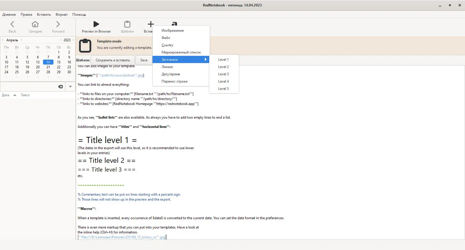 RedNotebook — это универсальный и удобный редактор для ведения личных дневников и записных книжек. Простое в использовании приложение позволяет сохранять мысли, важные события и идеи, делая их легко доступными благодаря автоматическому облаку тегов и календарю. Программа подходит для тех, кто ценит порядок в личных записях и ищет минималистичный, но функциональный инструмент для ежедневных заметок.