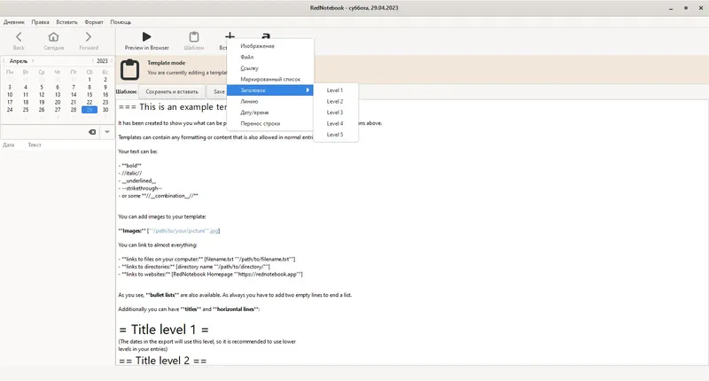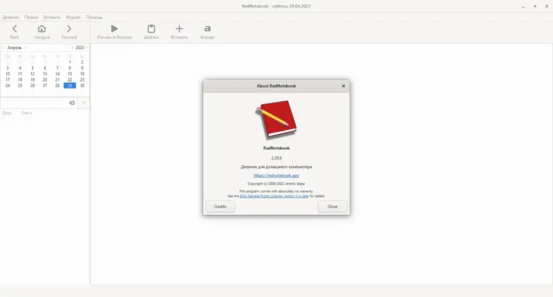 RedNotebook — это легкое GTK+ / Gnome приложение, написанное на языке Python, которое служит электронным дневником или записной книжкой. Оно позволяет сохранять все мысли, события, задачи и идеи, структурируя их по датам и тегам. Благодаря автоматическому созданию облака тегов и встроенному календарю, поиск нужной записи становится быстрым и удобным. Программа идеально подходит для тех, кто хочет упорядочить личную жизнь и вести подробные записи без лишних сложностей.