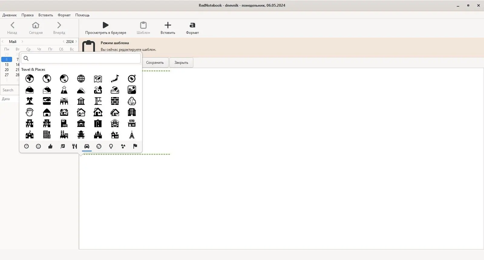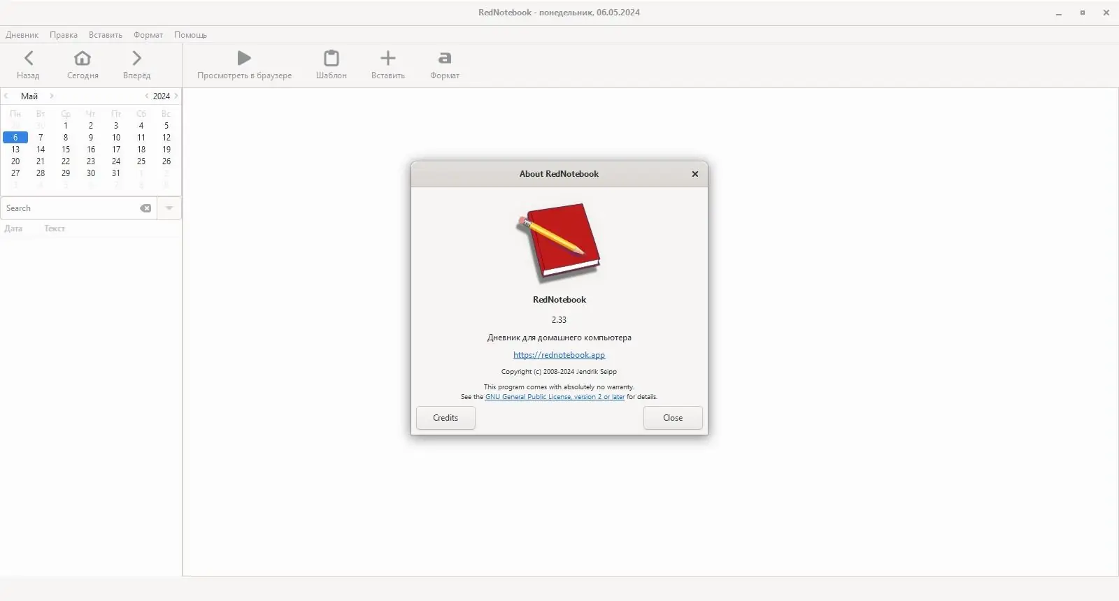 RedNotebook представляет собой электронный дневник, созданный на базе GTK+ и Gnome, написанный на языке Python. Он предназначен для быстрого и удобного фиксирования личных заметок, событий и мыслей. В программе реализованы функции поиска по тегам и календарю, что значительно упрощает навигацию и поиск нужных записей. Кроме того, RedNotebook обладает возможностью вставлять изображения и гиперссылки, что делает его универсальным инструментом для ведения дневника и ведения заметок.