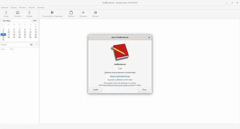 RedNotebook — это легкий и интуитивно понятный редактор заметок, выполненный на базе GTK+ и Gnome, написанный на языке Python. Он представляет собой электронный дневник, который позволяет сохранять личные записи, идеи и важные события в удобном интерфейсе. Благодаря автоматическому созданию облака тегов и встроенному календарю, поиск нужной заметки занимает всего несколько секунд. Программа обладает минималистичным дизайном, приятным интерфейсом и широкими возможностями по настройке шаблонов, что делает её универсальным инструментом для ведения ежедневника или записной книжки.