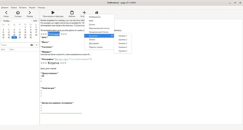 RedNotebook представляет собой универсальный редактор заметок с возможностью создания электронного дневника. Он обладает интуитивно понятным интерфейсом и широкими возможностями для оформления и структурирования информации. Благодаря автоматическому формированию облака тегов, пользователи легко ориентируются в своих записях, что делает программу идеальным инструментом для ведения дневника, планирования и хранения важных данных. Современные функции экспорта и резервного копирования обеспечивают безопасность и доступность информации в любом формате.