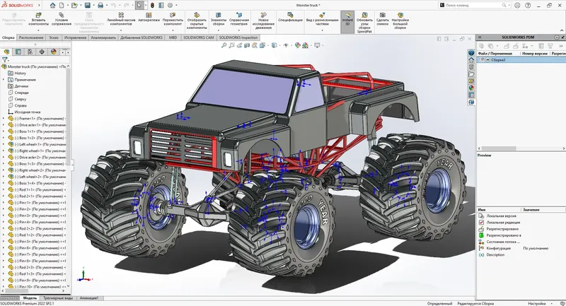 SolidWorks — это современное программное обеспечение, предназначенное для моделирования, анализа и автоматизации процессов производства. Используя гибридное параметрическое моделирование, оно позволяет создавать детализированные модели и чертежи, а также выполнять инженерный анализ для оценки прочности, тепловых и механических характеристик. Благодаря поддержке форматов ГОСТ и ЕСКД, программа идеально интегрируется в российскую промышленность, обеспечивая высокое качество и надежность проектных решений. Высокая производительность и удобство работы делают SolidWorks популярным выбором для разработки сложных деталей и сборочных единиц.