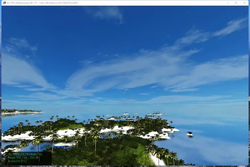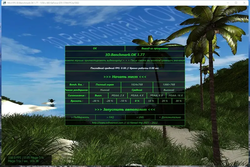 3D.Benchmark.OK — это легкий, но мощный инструмент для тестирования видеокарт, который не требует сложной настройки и позволяет получить быстрые результаты. Он включает в себя множество функций, таких как изменение уровня бенчмарка, регулировка сглаживания и тестирование различных графических эффектов, включая ветер, воду, преломление света, отражения и другие визуальные параметры. Благодаря своему интерфейсу программа подходит как для новичков, так и для профессиональных пользователей, желающих провести онлайн-сравнение данных с другими тестами или использовать автопилот для автоматического тестирования.