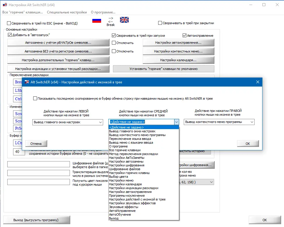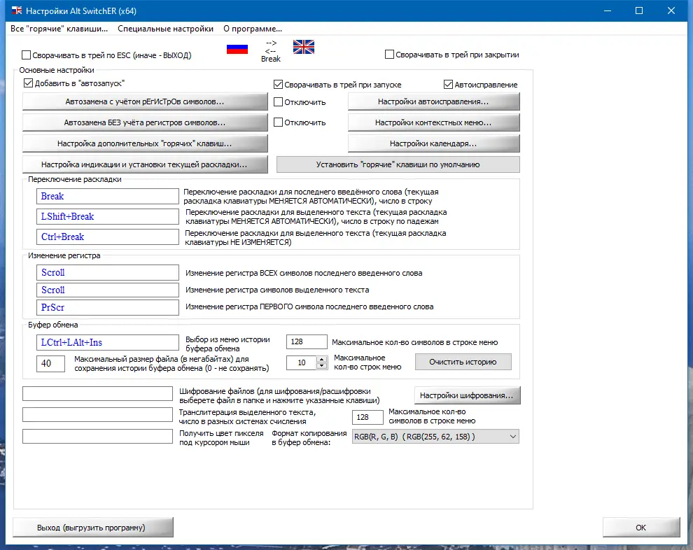Для начала работы с Alt Switcher достаточно скачать архив, распаковать его в любую папку и запустить исполняемый файл. После запуска программа автоматически активируется и отображает иконку в системном трее, которая показывает текущий язык ввода. В настройках можно назначить горячие клавиши для быстрого переключения раскладки, включения или отключения автоисправления, а также для выполнения других команд. В программе предусмотрена возможность ручного и автоматического добавления слов в пользовательский словарь, изменение регистра, транслитерация и шифрование файлов. Все функции удобно управляются через главное окно или через горячие клавиши, что обеспечивает быстрый доступ к нужным инструментам без отвлечения от работы.