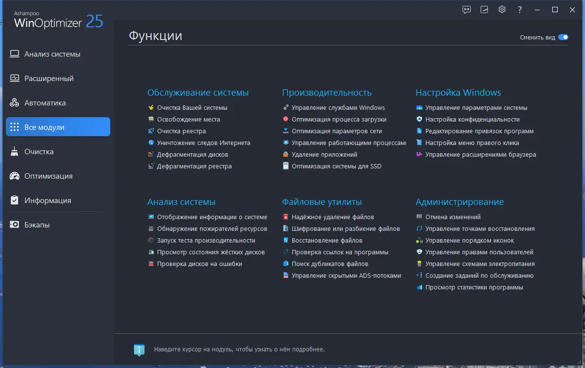 Ashampoo WinOptimizer представляет собой современный комплекс системных утилит, который позволяет легко и быстро оптимизировать работу Windows. В состав программы входят утилиты для очистки ненужных файлов, поиска и удаления старых обновлений, а также инструменты для настройки конфиденциальности и безопасности. Программа поддерживает все актуальные версии Windows, включая Windows 11, и обеспечивает максимальную эффективность работы системы при минимальных затратах времени.