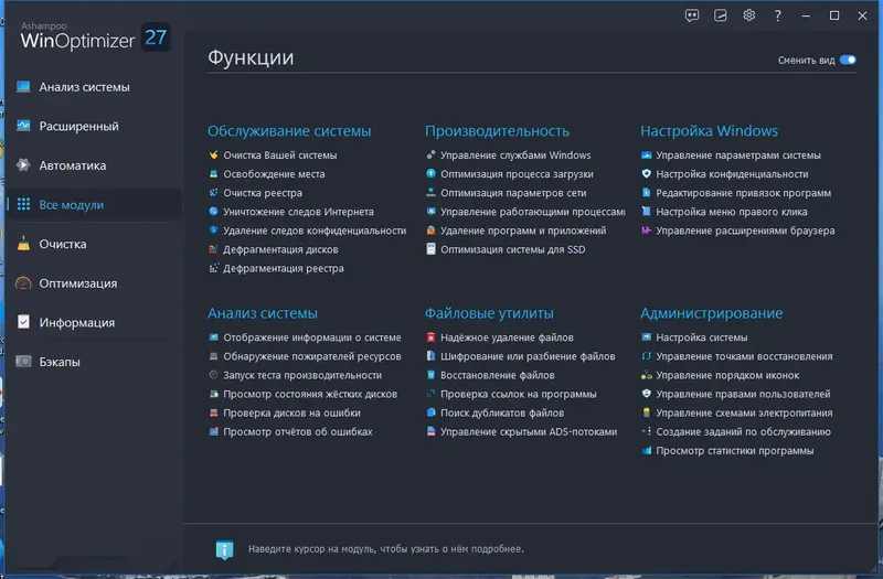 - Множество дополнительных модулей для расширенной настройки ПК.