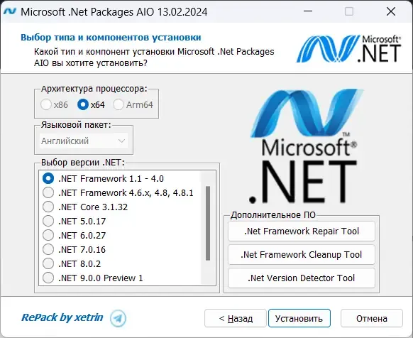 ASoft.NET Detector — это универсальный инструмент, предоставляющий подробную информацию о версиях Microsoft .NET Framework и .NET Core, установленных на системе. Интерфейс программы выполнен в виде цветных прямоугольников, где отображаются доступные версии. Белым цветом выделены установленные версии, серым — отсутствующие, а кликая на стрелки рядом с версиями, можно перейти на страницы загрузки или SDK на сайте Microsoft. В нижней части отображается детальная информация о номерах версий, папках установки и списке всех установленных компонентов. Программа работает независимо от наличия .NET Framework и позволяет быстро диагностировать состояние платформы.