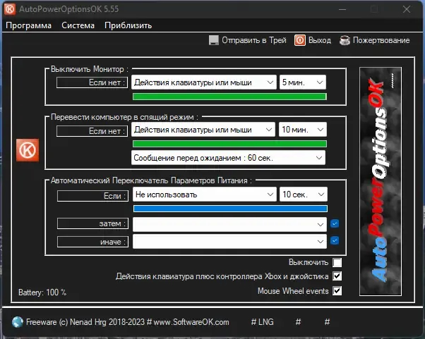 AutoPowerOptionsOK — это компактная и удобная утилита для настройки параметров питания компьютера. Она позволяет автоматизировать управление режимами энергосбережения, такими как выключение монитора, переход в режим сна или переключение между различными планами электропитания по заданным интервалам времени. Благодаря простоте использования и низкому потреблению ресурсов программа идеально подойдет для пользователей, желающих повысить комфорт и эффективность работы системы.