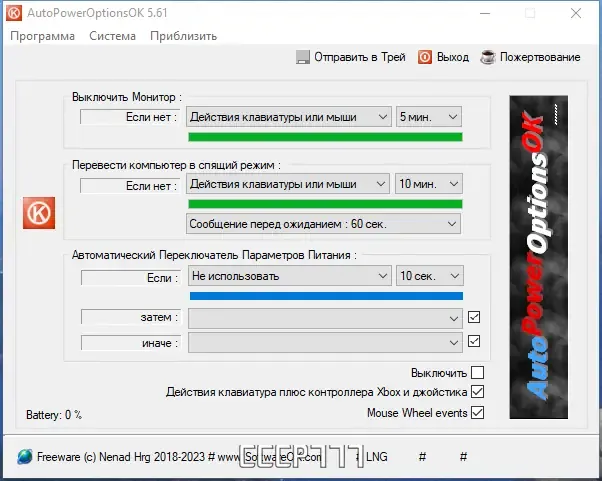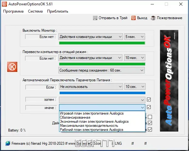 Для настройки программы необходимо запустить AutoPowerOptionsOK и выбрать желаемые параметры для выключения монитора, режима сна или переключения планов электропитания. После этого можно установить интервалы времени для автоматического выполнения выбранных команд. Все настройки сохраняются автоматически и начинают работать сразу после завершения конфигурации. В случае необходимости можно быстро отключить или изменить параметры через доступное меню программы в системном трее.