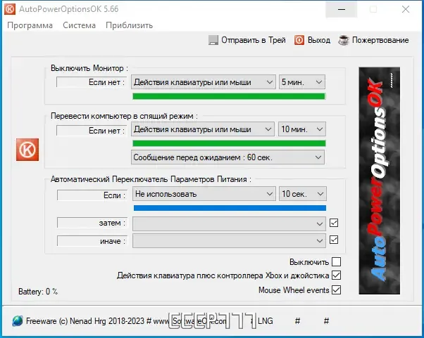 AutoPowerOptionsOK — небольшая и удобная утилита, предназначенная для автоматического управления параметрами питания компьютера. Она позволяет настраивать выключение монитора, перевод системы в режим сна и переключение между различными планами электропитания по заданным интервалам времени. Благодаря минимальному потреблению ресурсов, программа отлично подходит для автоматизации рутинных задач без нагрузки на систему.