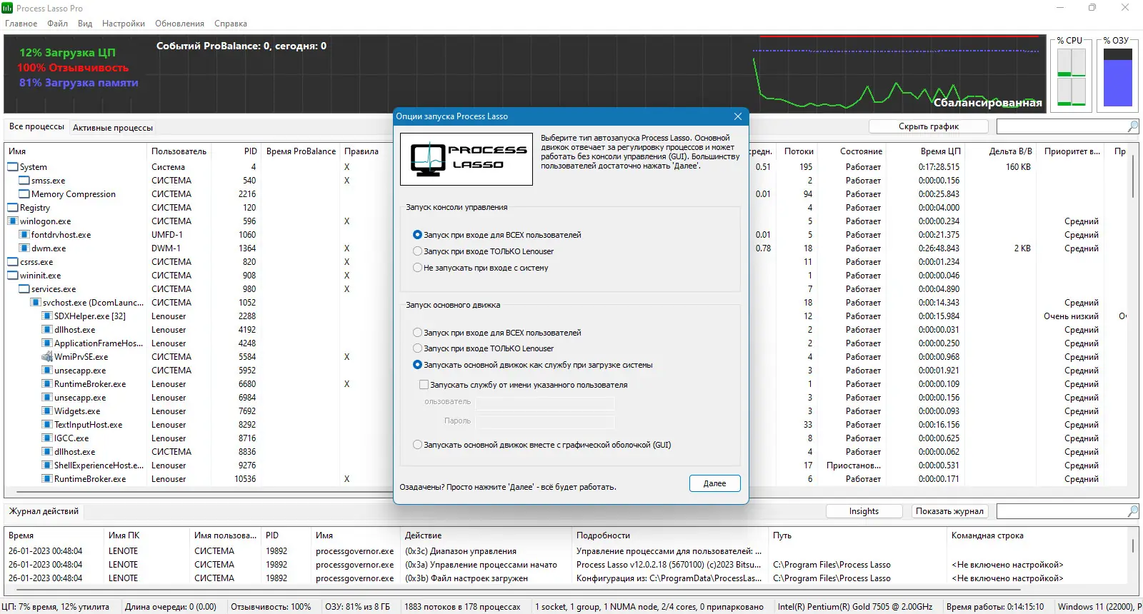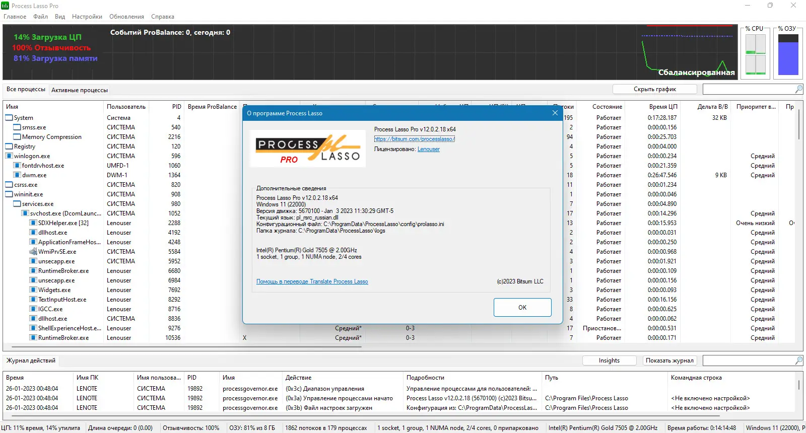 Bitsum Process Lasso — это мощная системная утилита, предназначенная для управления запущенными процессами и повышения общей производительности компьютера. Она позволяет вручную или автоматически оптимизировать работу процессов, предотвращая зависания и снижая нагрузку на центральный процессор. Благодаря технологии ProBalance программа обеспечивает стабильную работу системы, перераспределяя приоритеты задач и уменьшая влияние ресурсоемких процессов на отклик системы.