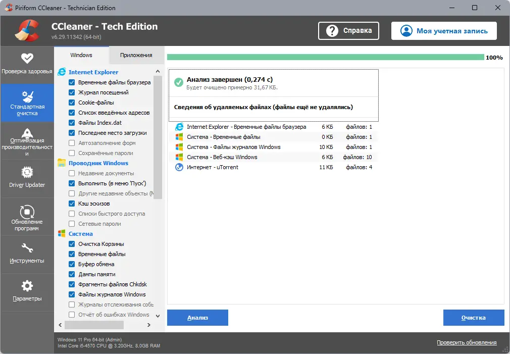- Удаление временных и неиспользуемых файлов из браузеров и системы