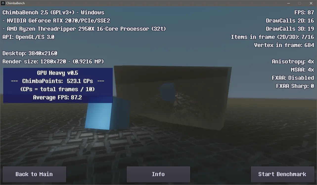 ChimbaBench обеспечивает точное измерение производительности видеокарты и простоту использования, что делает его незаменимым инструментом при диагностике и сравнении графических решений.