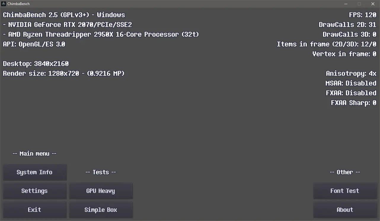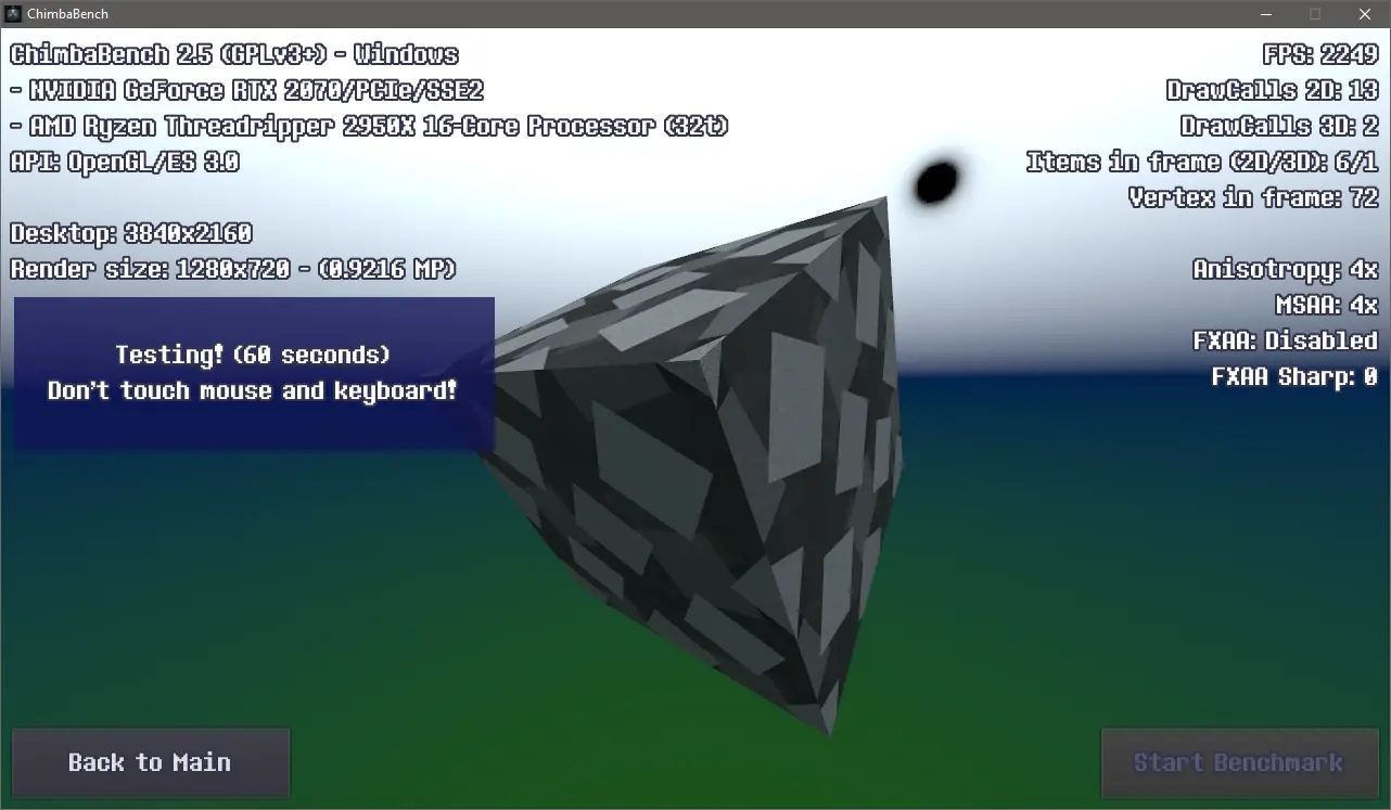 ChimbaBench — это легкий и функциональный бенчмарк, созданный для быстрого определения возможностей видеокарты и отображения результатов в удобной форме. Программа поддерживает работу на различных платформах, включая Linux и Windows, и обладает расширенными возможностями настройки. Она позволяет проводить тесты как в автоматическом режиме, так и вручную, предоставляя точные показатели производительности видеокарты, что делает ее ценным инструментом для системных администраторов, геймеров и энтузиастов. В процессе тестирования отображаются показатели в виде красочных «попугаев», а также в привычных единицах fps, что облегчает анализ и сравнение результатов.