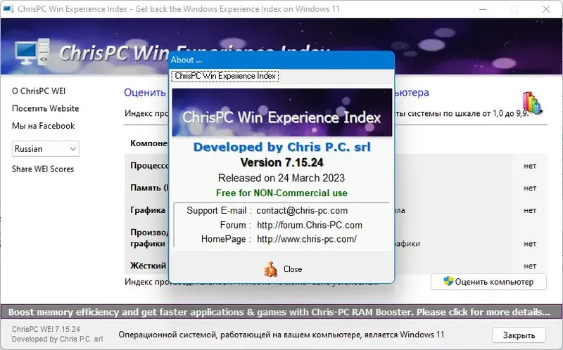 ChrisPC Win Experience Index — это бесплатная утилита для быстрого и точного измерения системного индекса производительности в операционной системе Windows. В отличие от стандартных инструментов, она расширяет возможности оценки, предоставляя подробную информацию о состоянии компонентов ПК. Программа проста в использовании и не требует дополнительных настроек, что делает её полезной как для опытных пользователей, так и для новичков.