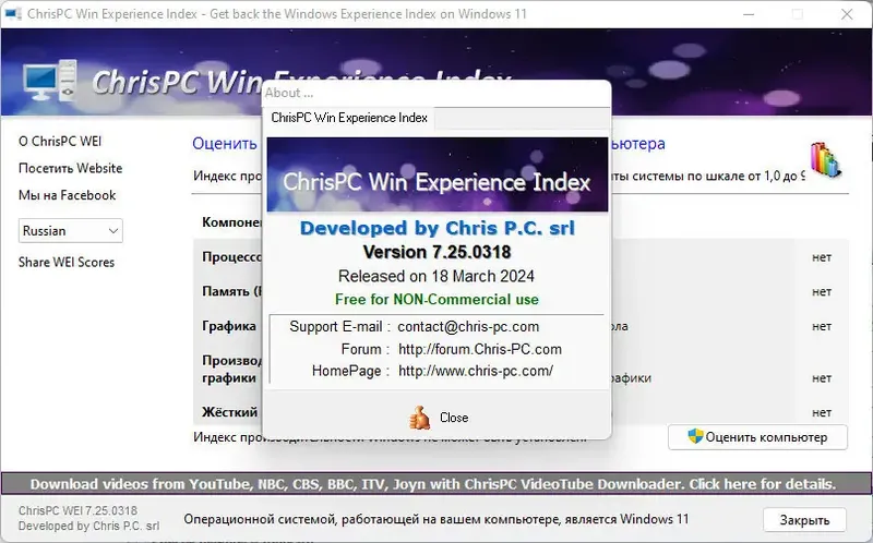 ChrisPC Win Experience Index — это удобный инструмент для оценки общего уровня производительности системы Windows. Он восстанавливает функцию оценки, которая в новых версиях Windows была удалена или скрыта. Благодаря интуитивно понятному интерфейсу и быстрому процессу установки, программа позволяет получить детальную информацию о состоянии системы всего за несколько кликов. Результаты отображаются по шкале от 1.0 до 9.9, что помогает определить слабые места и принять меры по их улучшению.