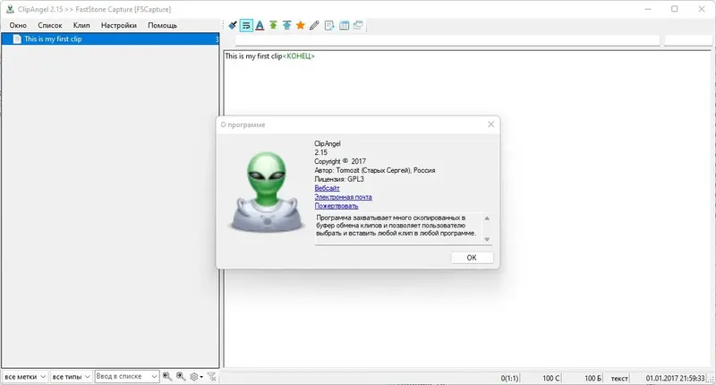 ClipAngel — это легкий и удобный менеджер буфера обмена, который позволяет сохранять и управлять различными типами копируемых данных. Программа поддерживает все основные форматы текста, такие как простой текст, RTF и HTML, а также графические файлы и документы. Благодаря быстрому поиску, предпросмотру и расширенным возможностям фильтрации, она значительно упрощает работу с скопированными данными и повышает эффективность использования буфера обмена. Интерфейс программы изначально выполнен на русском языке, но также доступен на английском, французском и других языках, что делает ее удобной для пользователей по всему миру. Программа была создана в 2017 году и активно развивается, за счет заимствования и внедрения лучших функций аналогичных решений.