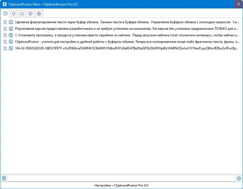 ClipboardFusion — это универсальная системная утилита, которая расширяет функциональность стандартного буфера обмена. Ее основная задача — хранить все скопированные элементы в памяти и предоставлять быстрый доступ к ним в любой момент. Помимо простой функции копирования и вставки, программа умеет автоматически очищать форматирование текста, что особенно актуально при работе с контентом из интернета. Также она позволяет заменять слова и символы, управлять буфером при помощи макросов, а также синхронизировать содержимое между несколькими устройствами. Встроенная поддержка горячих клавиш делает использование максимально удобным и быстрым. ClipboardFusion занимает минимум системных ресурсов, не мешая работе других приложений и не снижая производительность ПК, что делает его отличным выбором для профессионалов и обычных пользователей.
